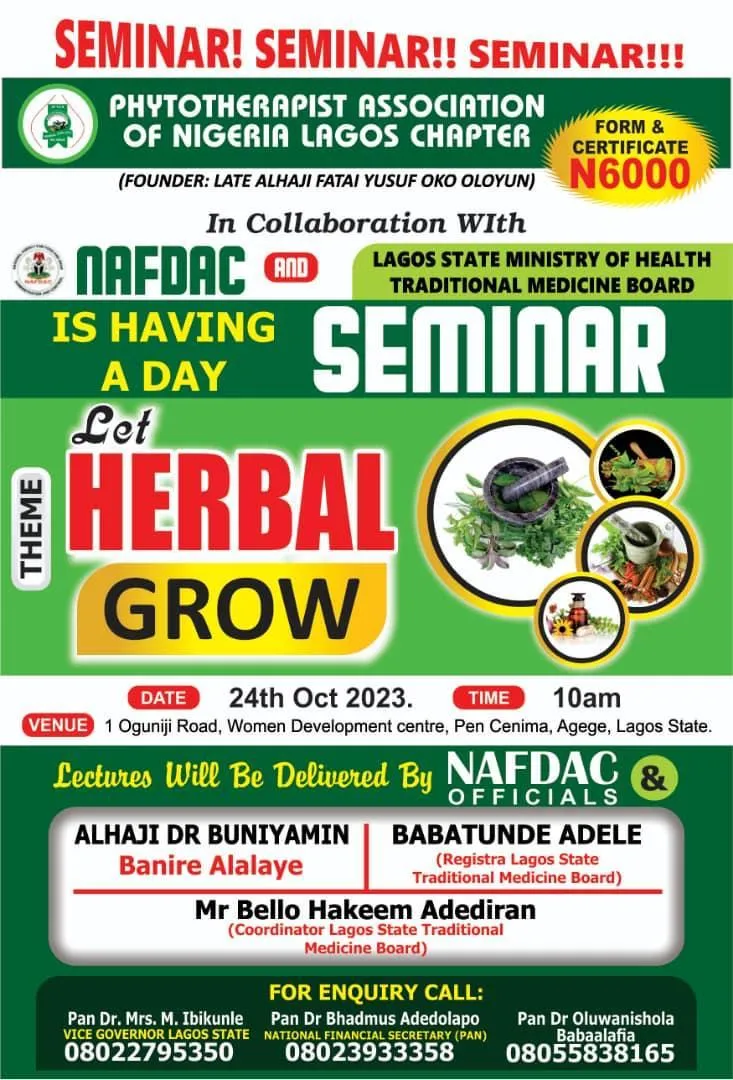 The Phytotherapists Association of Nigeria (PAN) was founded in February 2017 by Alhaji Fatai Yusuf (Oko Oloyun) and other notable herbal practitioners across the country.